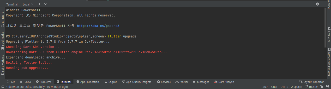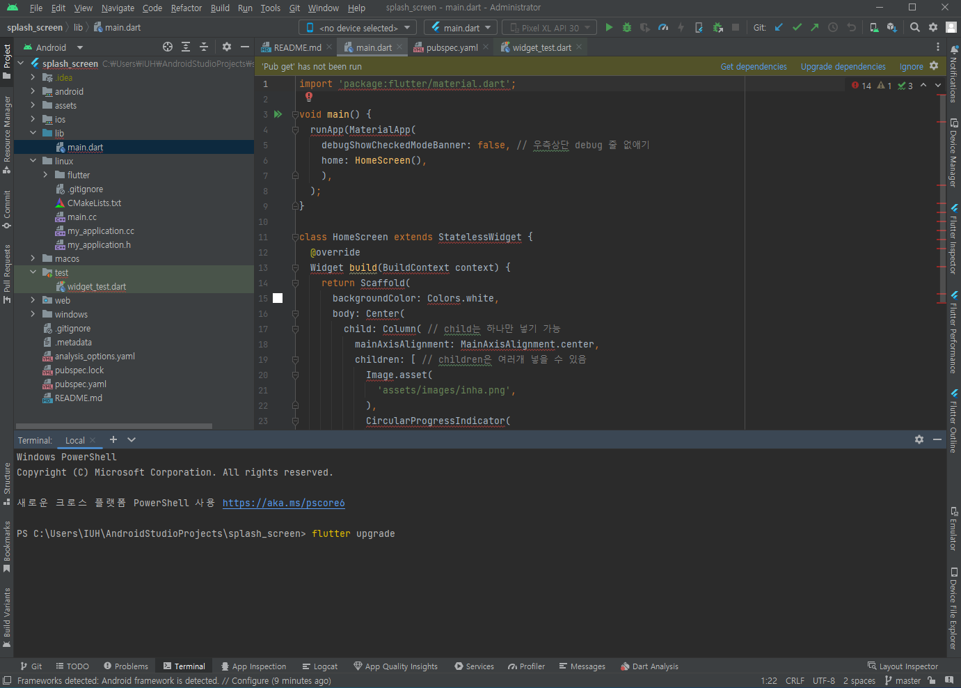 flutter upgrade가 끝나면 flutter pub get을 수행하여 새로운 dependencies를 가져오자!! 끄읕